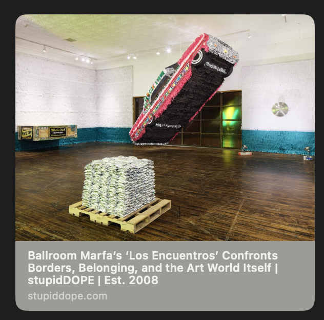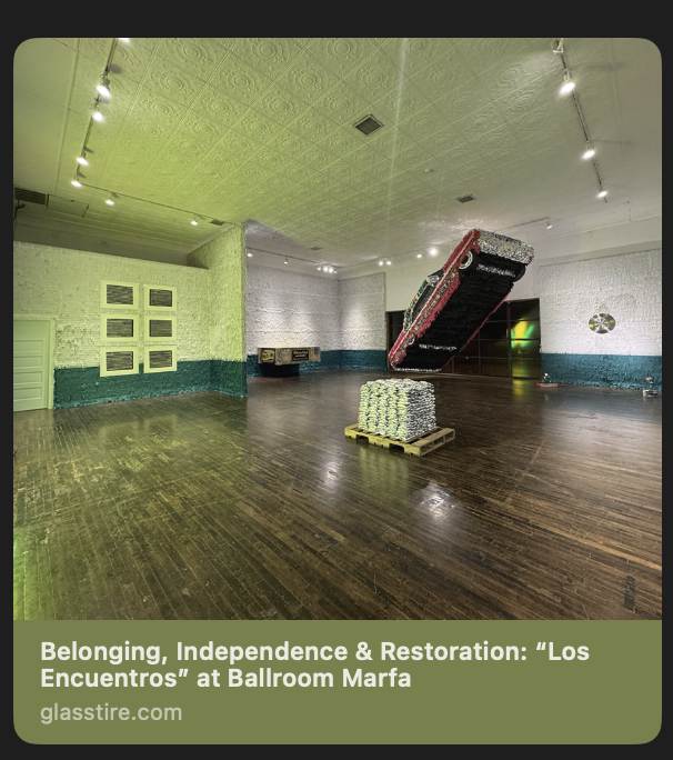 Los Encuentros at Ballroom Marfa, Marfa, TX brings together the work of Justin Favela, Ozzie Juarez, Antonio Lechuga, Narsiso Martinez and Yvette Mayorga, Latinx artists working with the imagery and materials of everyday life to disrupt conventional notions of art history and to confront societal issues head on. Each artist is represented by large-scale works made from familiar materials to challenge traditional art spaces, push past limits, and engage us in dialogue about identity and community, often with humor. These artworks transcend artificial boundaries between craft, painting, and sculpture, blurring the lines of visual languages and destabilizing our expectations. The artists create work that is deeply personal, inclusive, and resonant with their own experiences, while addressing class, borders, and culture. For Los Encuentros, each artist is responding to Marfa—as a hallowed site for art world luminaries, as a border town, and as a place where the art world ethos is juxtaposed with everyday lived experience.